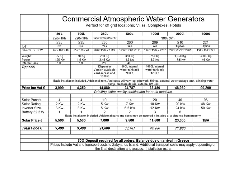 from 500 to 50,000 litres per day. 1-phase, 3-phase and solar powered options