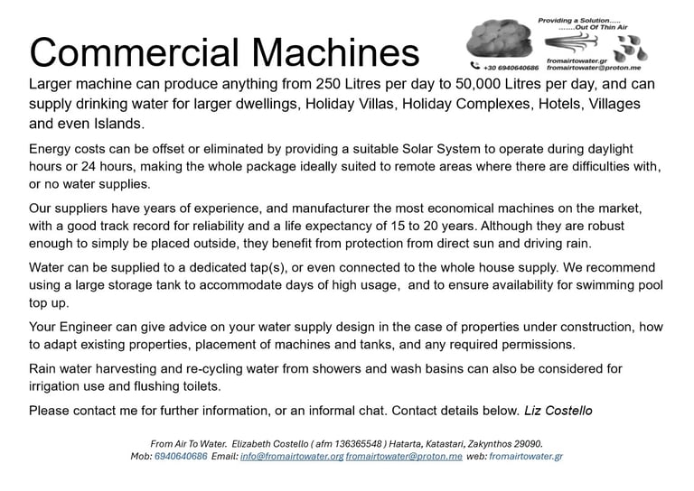 Commercial machines come in many sizes and configurations, with several power options, including solar power and a structured maintenance schedule. We also select the best options from various manufacturers to suit each situation. For these reasons the machines shown on this website are for illustrative purposes only. Please contact us if you would like more details, and we will arrange for a consultation with the suppliers.
