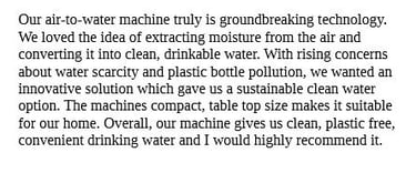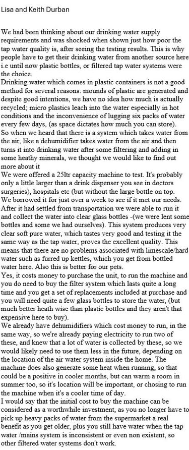 Since I started my business 'From Air To Water' I have been acutely aware that the water problems of 2024 and earlier would no doubt resurface in 2025. Already the reports have started. So at long last, today, after weeks of planning and effort I have finished installing an 80Litre per day water making machine and gone off (water) grid (except toilet. More details on that later). I'm so excited. Instantly my critical water measurements have drastically improved. PPM down from an undrinkable 1582 to 6. EC down from an unfit for at purpose of 3164 to 14. Now the system is flushed, I can drink from the tap FOR THE FIRST TIME EVER. Showering is a learning curve as I need so little Shampoo etc. Next week the final part should arrive to connect the water generator to my solar panels, and water generation will then be free. I should say that I have gone from 2 x 9 litre packs of bottled water a day (drinking water, animals water, cooking) at 1.75e each to zero, saving 105e per month, so the machine will pay for itself, and with free electricity to run it, t's a win - win for me AND the environment, as I'll be saving 3,480 bottles every year. And I can't wait for he washing machine to be switched over, also next week. I won't have to contend with smelly sulphur water, and the washing will smell lovely.
